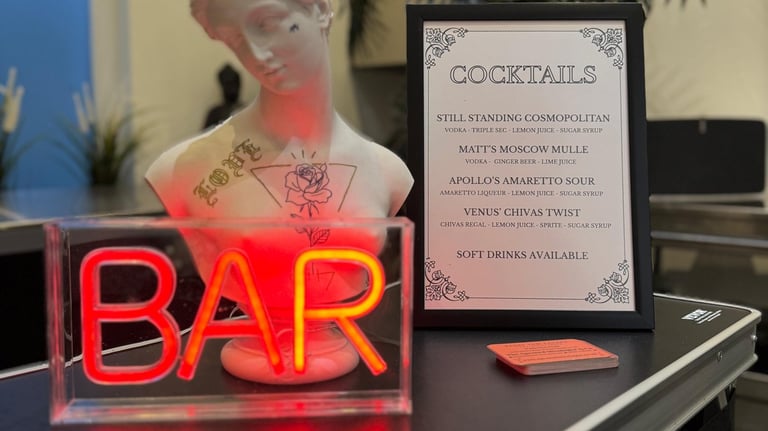 We create a personalised shopping list based on your chosen cocktails and the estimated number of guests. You will purchase the alcohol, mixers, juices, fruit, and ice according to this list.Set-Up: