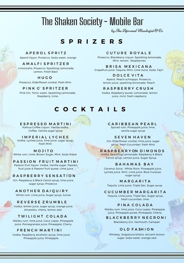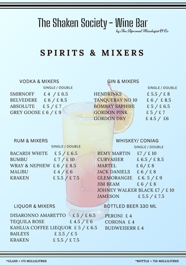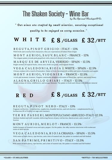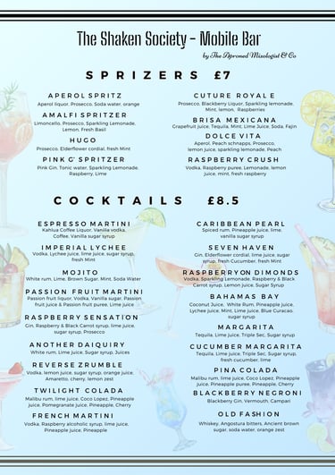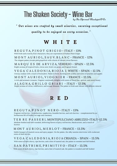 Wines & cocktails menu, including reception drinks, cocktails, wines, and more. Packages can be expanded with additional products or customised to suit your preferences. Glasses, staff, and a mobile bar are included in the price. For quotes, please use the enquiry page
